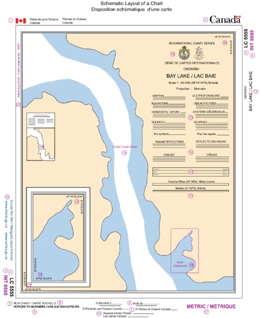 For help using your chart, refer to the Schematic layout of a paper chart as seen in Canadian Chart 1 - Symbols, Abbreviations and Terms (free for download).